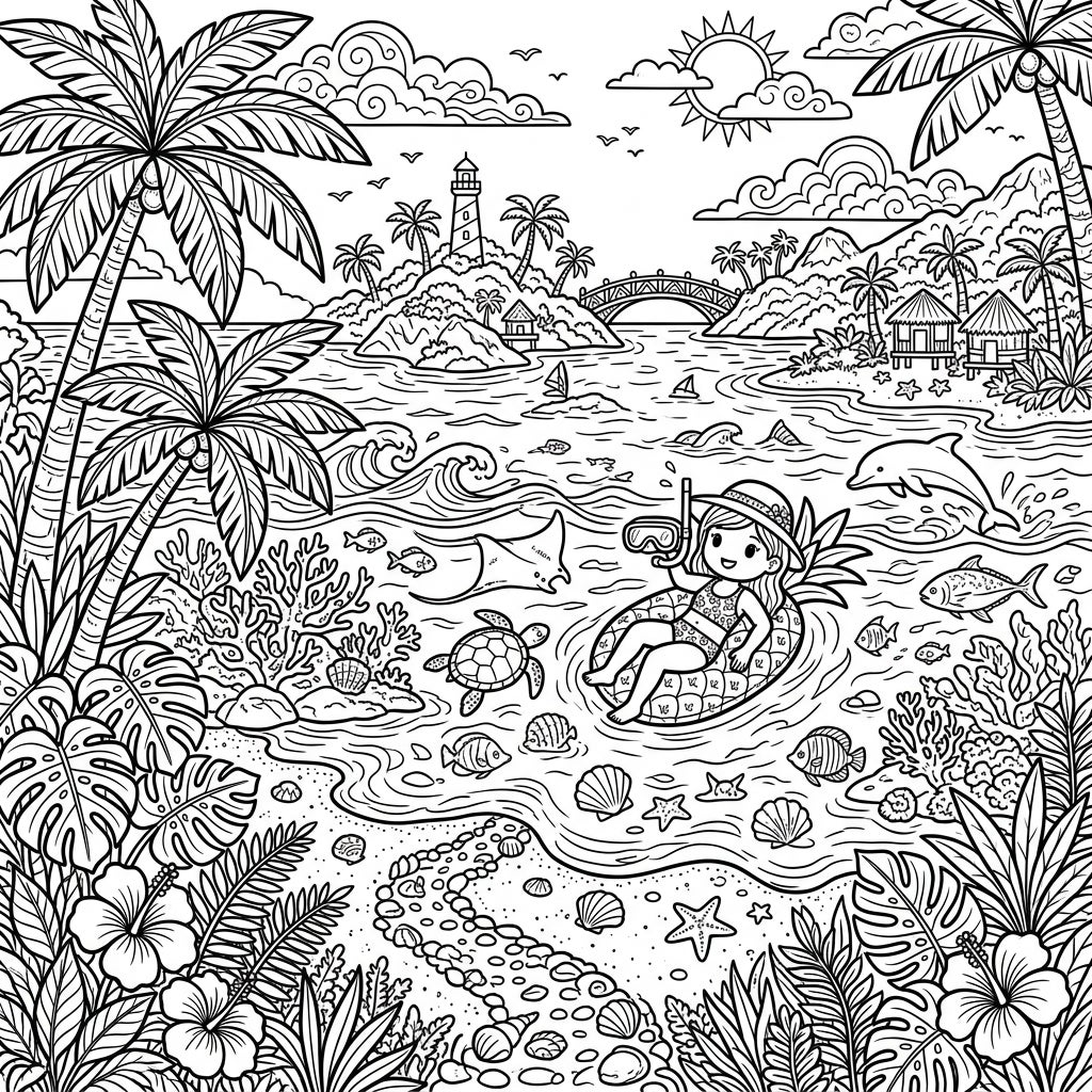 Dive into a vibrant adventure with this intricate coloring page, perfect for teens who dream of sunny getaways. The scene captures a joyful moment with a girl relaxing on a fun pineapple float in crystal-clear ocean waters, snorkel and mask ready for underwater exploration. Around her, a bustling marine ecosystem thrives, featuring a friendly dolphin leaping, a curious turtle gliding, various fish, a graceful manta ray, and detailed coral formations. Palm trees sway gently on the sandy shores, framing a perfect day in paradise.