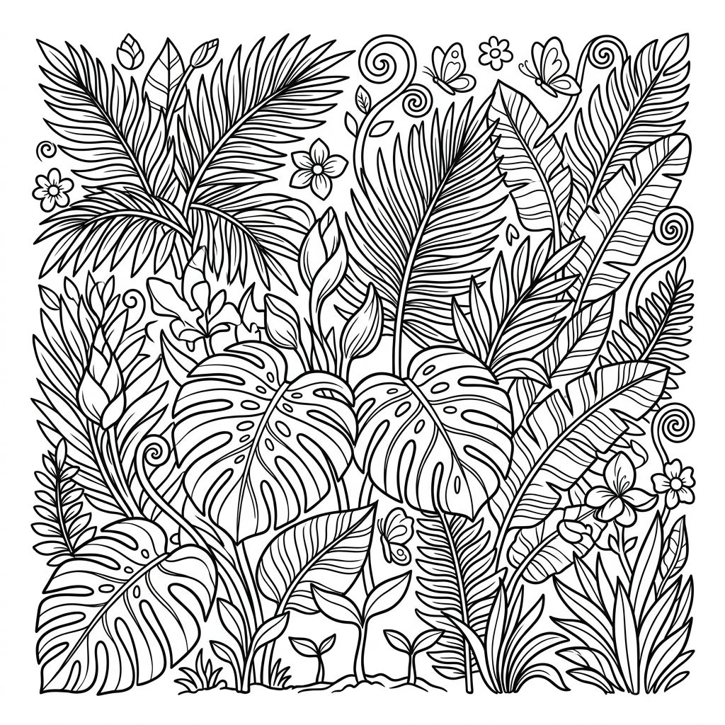 Dive into a verdant paradise with this intricately designed coloring page, brimming with the lush beauty of tropical foliage. Discover the iconic split leaves of monstera, the delicate fronds of palm trees, and the broad, elegant shapes of banana leaves, all interwoven to create a captivating natural tapestry. Amidst this dense greenery, you'll spot budding flowers, tiny sprouts emerging from the soil, and playful butterflies, adding delightful details to your coloring journey.