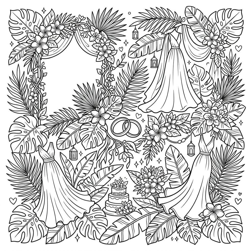 Discover an enchanting tropical wedding scene ready for your artistic touch! This intricate coloring page is filled with abundant monstera, palm, and banana leaves, creating a lush, exotic backdrop. Elegant wedding dresses, a beautiful floral arch, delicate wedding rings, a charming tiered cake, and a sweet bouquet are all artfully intertwined within the foliage, offering a rich tapestry of details to explore.