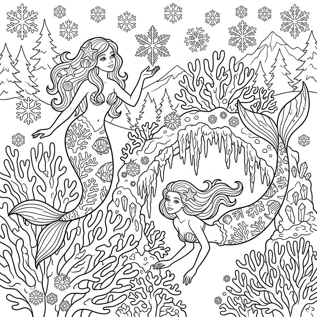 Embark on an extraordinary coloring journey with this captivating scene featuring tropical mermaids in an unexpected winter wonderland. This intricate illustration showcases two graceful mermaids, one adorned with a starfish and seashells in her flowing hair, and the other swimming serenely. Their tails are beautifully detailed with patterns of fish and coral, blending seamlessly with the surrounding underwater landscape of various coral types, icy formations, and glittering crystals.