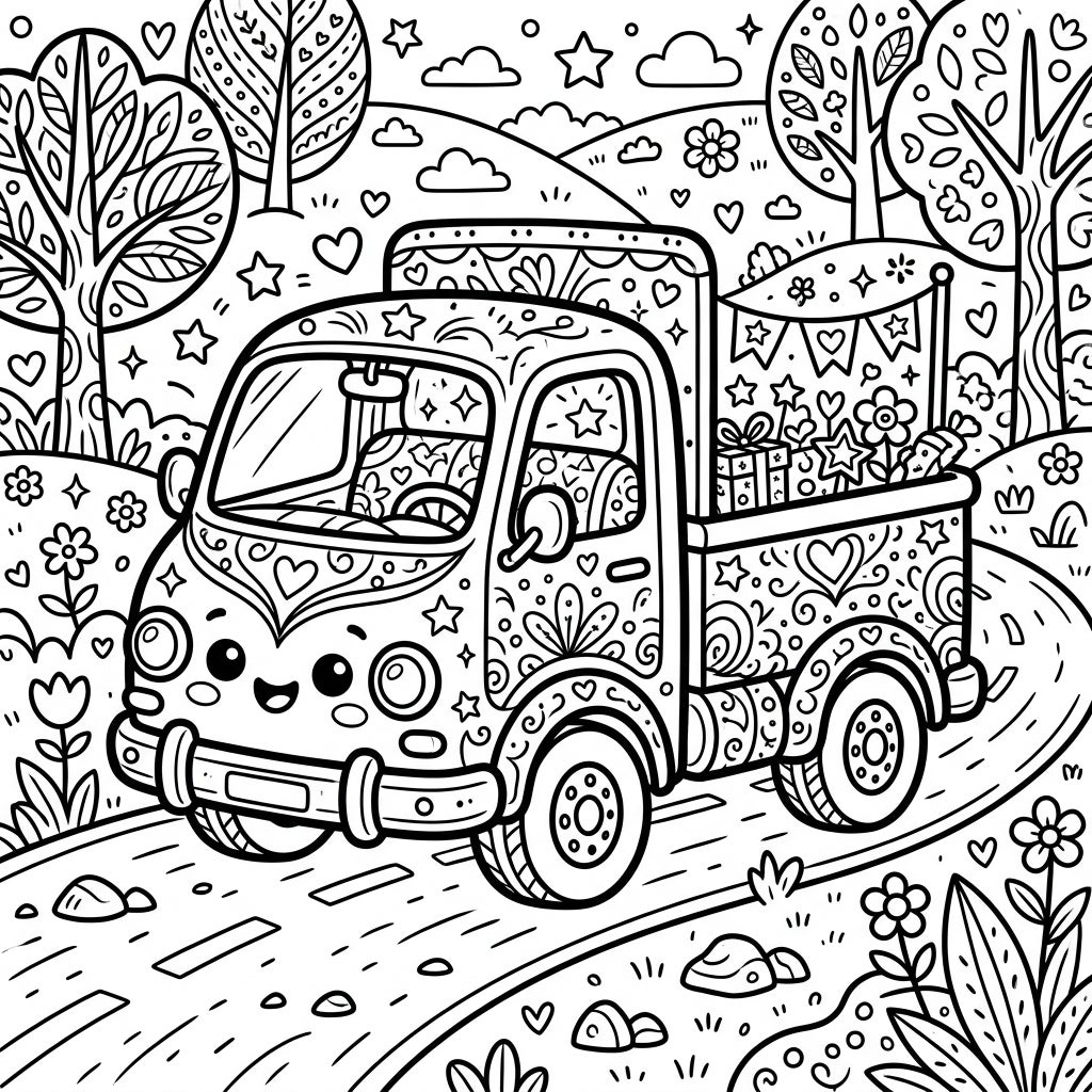 Embark on a charming artistic journey with this incredibly detailed Kawaii truck coloring page. Our friendly pick-up truck, sporting an irresistibly cute smiling face and bold, rounded shapes, is adorned with an abundance of intricate patterns, from hearts and stars to swirls and floral motifs. Its truck bed is overflowing with joy, featuring beautifully wrapped gift boxes, blossoming flowers, and a festive bunting banner, all set against a backdrop of rolling hills, whimsical trees, puffy clouds, and scattered stars and hearts.