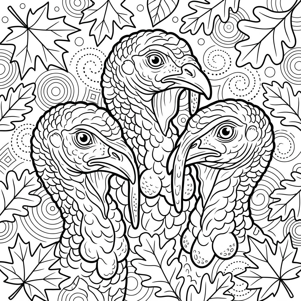 Dive into a captivating coloring adventure with our 'Detailed Turkey Heads' page, thoughtfully crafted for senior colorists. This intricate design showcases three majestic turkey heads, each rendered with exceptional detail, highlighting their distinctive snoods, wattles, and expressive eyes. The clear, bold outlines ensure accessibility and comfort, making it easy to stay within the lines, while the textured feathers add an engaging element for your artistic touch. Surrounding these proud avian figures is a charming backdrop of various autumn leaves—maple and oak—interspersed with subtle, swirling patterns, all designed to offer a rich and fulfilling coloring experience.
