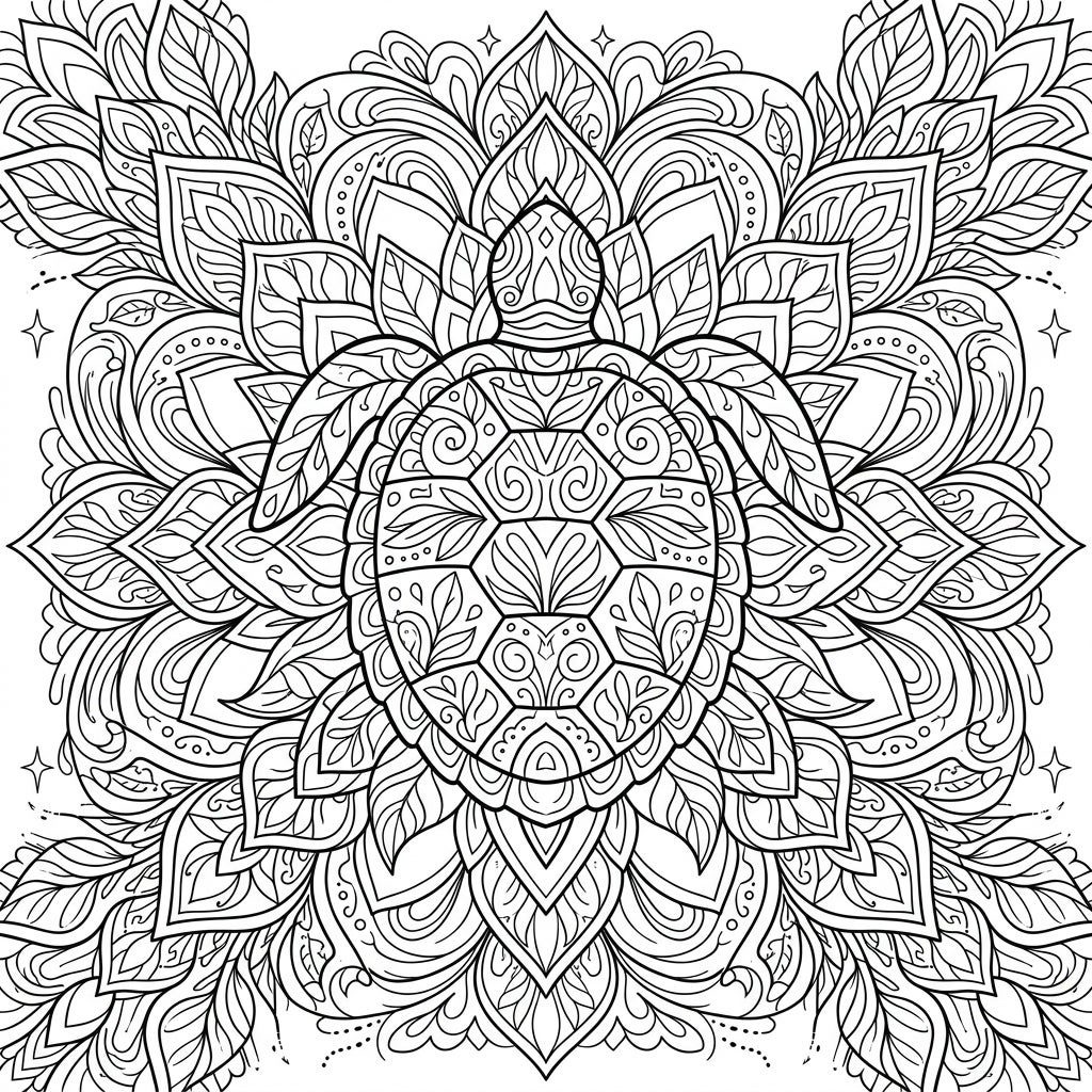 Immerse yourself in the serene beauty of this intricate turtle mandala coloring page. At its heart, a majestic turtle is depicted with an exquisitely detailed shell, featuring swirling motifs and geometric segments. Surrounding this gentle creature is a breathtaking radial mandala, brimming with finely drawn botanical elements, elegant scrolls, and symmetrical patterns that gracefully expand to fill the entire square canvas.