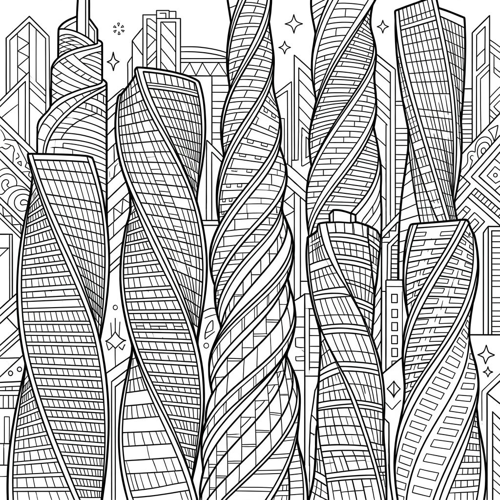 Explore the dazzling world of modern architecture with this intricate twisted skyscrapers coloring page. Perfect for those who love detailed cityscapes and unique building designs, offering hours of creative relaxation.