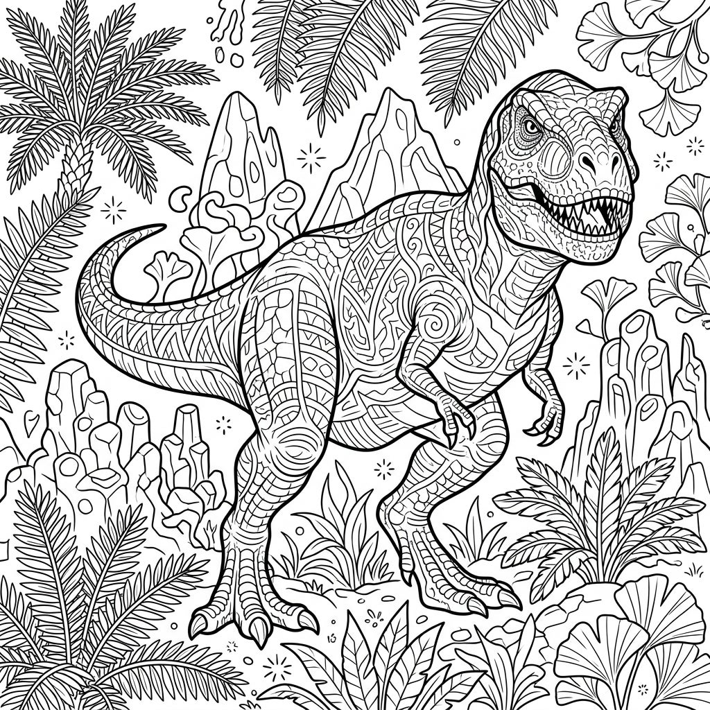 Dive into the ancient world with this stunning adult coloring page featuring a majestic Tyrannosaurus Rex. Adorned with intricate patterns and surrounded by lush prehistoric flora, it offers a challenging yet relaxing artistic escape.