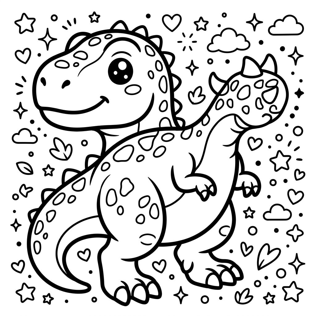 Dive into a world where prehistoric meets adorable with this unique Kawaii Tyrannosaurus Rex coloring page. This charming illustration features a friendly T-Rex, complete with thick bold outlines, round shapes, and an endearing, simple face, accompanied by a smaller, equally cute dinosaur companion. The entire page is a canvas of joy, with a background playfully scattered with stars, hearts, and tiny clouds, inviting a rich and immersive coloring experience.