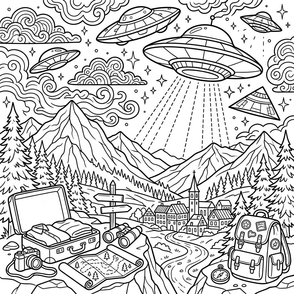 Prepare for an adventure that's truly out of this world with our 'UFO Sightings on Vacation' coloring page! This intricate illustration invites you to a breathtaking mountain landscape where pine forests, towering peaks, and a charming European-style village set the scene for an unexpected encounter. Look closely, and you'll find an open suitcase packed for travel, a classic camera, binoculars ready for stargazing, and a detailed map hinting at epic explorations. On the other side, a ready backpack and a trusty compass complete the explorer's gear, all perfectly arranged for your coloring creativity.