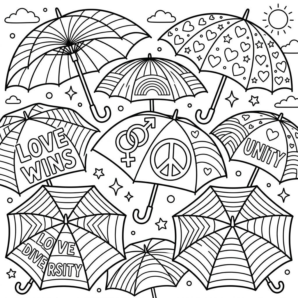 This unique design beautifully blends the iconic imagery of umbrellas – often symbolizing protection and comfort – with the joyous and inclusive spirit of Pride. It's a wonderful way to celebrate individuality and solidarity, reflecting the warmth and togetherness that define Pride Month. Let your imagination soar as you infuse each element with the colors of acceptance and joy.