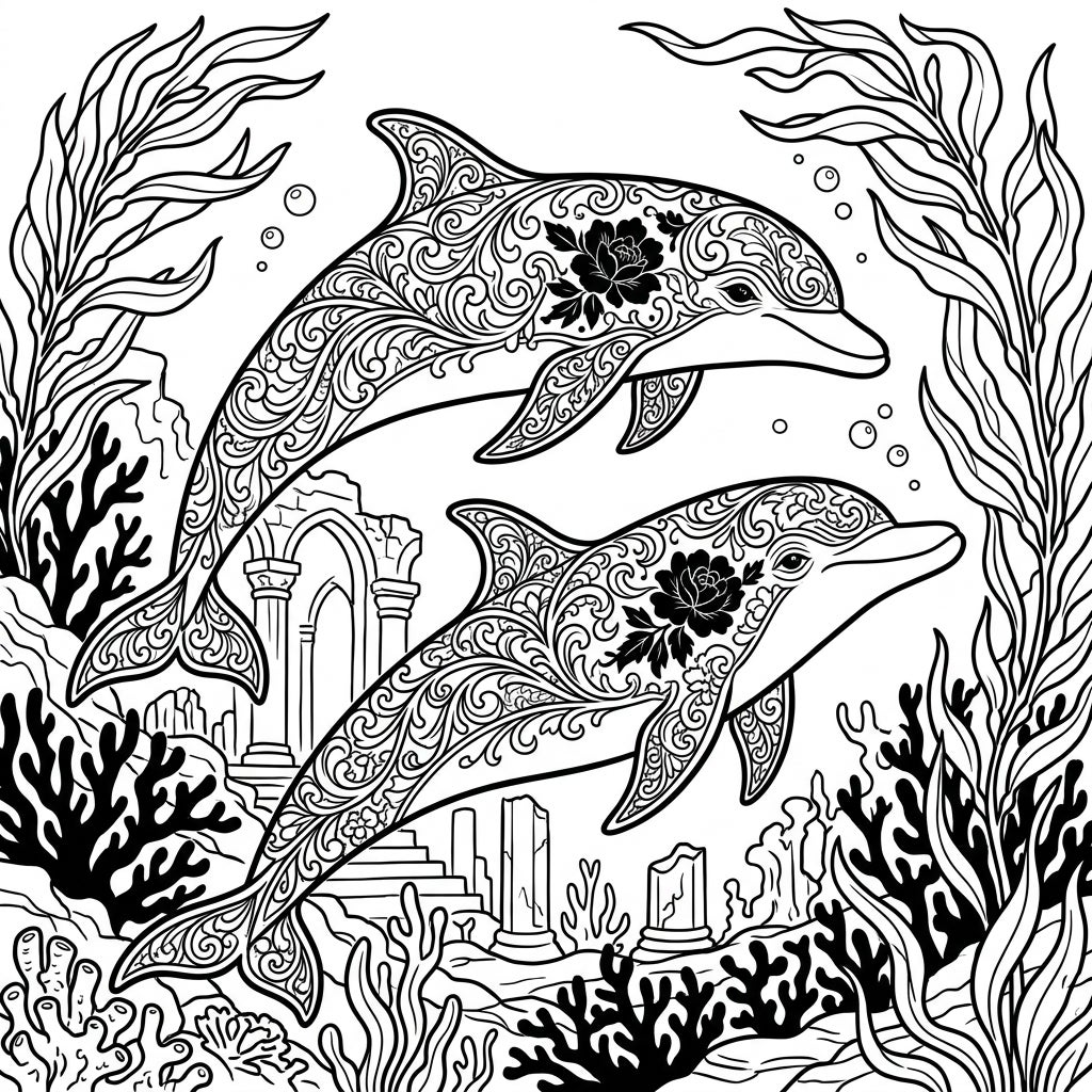 Dive into a breathtaking aquatic realm where two graceful dolphins are transformed by an exquisite Gothic aesthetic. Their forms are beautifully embellished with intricate, swirling patterns reminiscent of Victorian lace, each featuring a striking black rose on its flank. This detailed illustration captures them gliding through a mesmerizing underwater landscape, surrounded by the remnants of ancient sunken ruins, melancholic coral formations, and dramatic, flowing kelp, inviting you to explore every line with your colors.