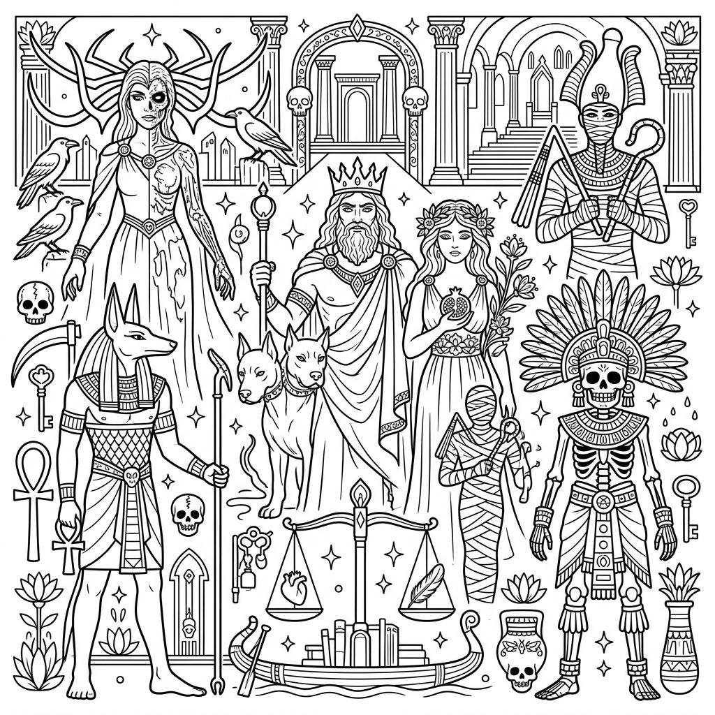 Delve into the captivating realms of myth with our Underworld & Death Deities coloring page, showcasing powerful gods and goddesses from diverse cultures. Discover intricate depictions of figures like Hades, Anubis, and Persephone, ready for your creative touch.