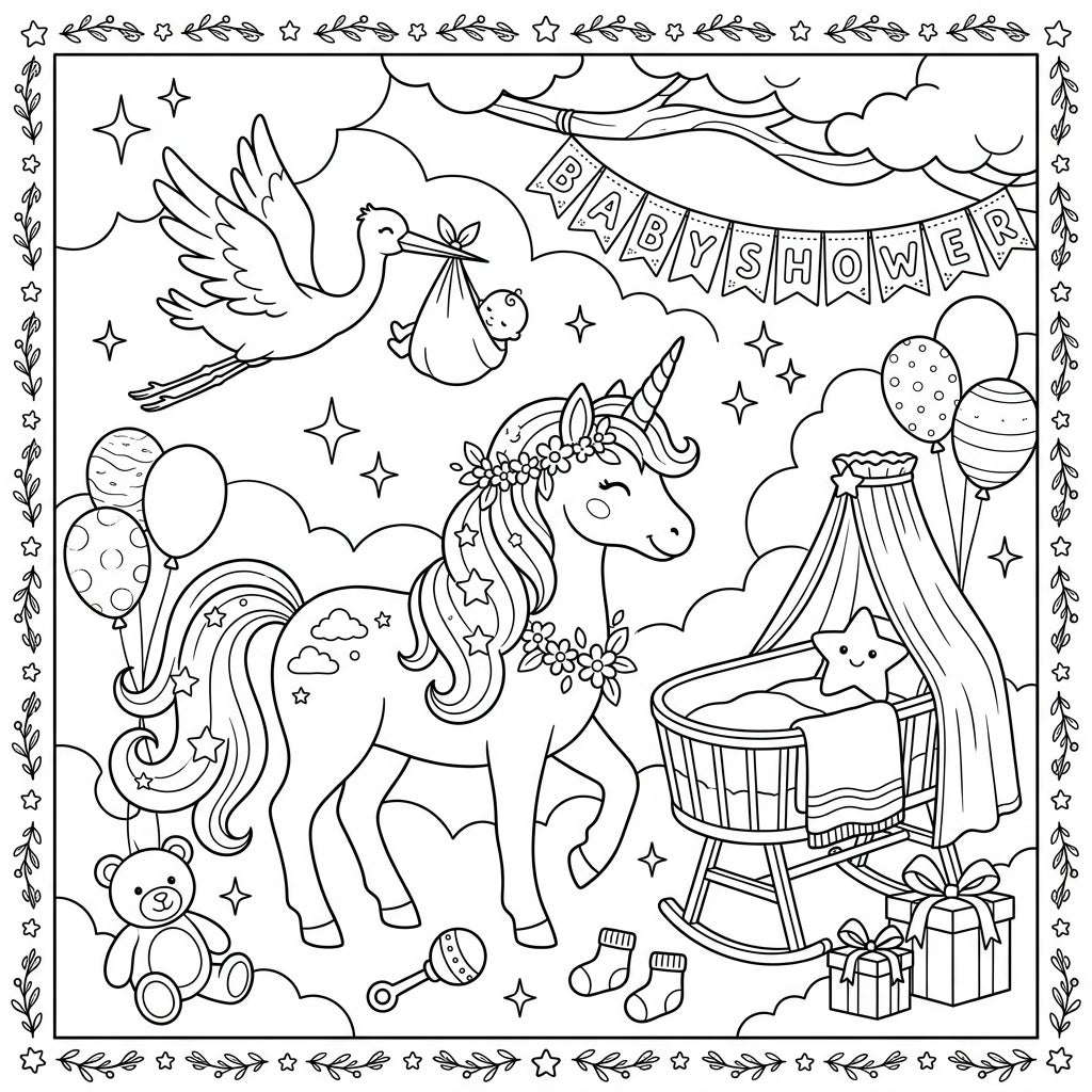 This delightful coloring page perfectly captures the joyous and hopeful mood of a baby shower, blending the magic of unicorns with the tender anticipation of welcoming a new life. It's a celebration of love, dreams, and new beginnings, creating an an atmosphere of pure enchantment. Imagine the soft coos and happy giggles as friends and family gather to shower the parents-to-be with affection and gifts, all under the watchful, gentle gaze of our mythical friend.