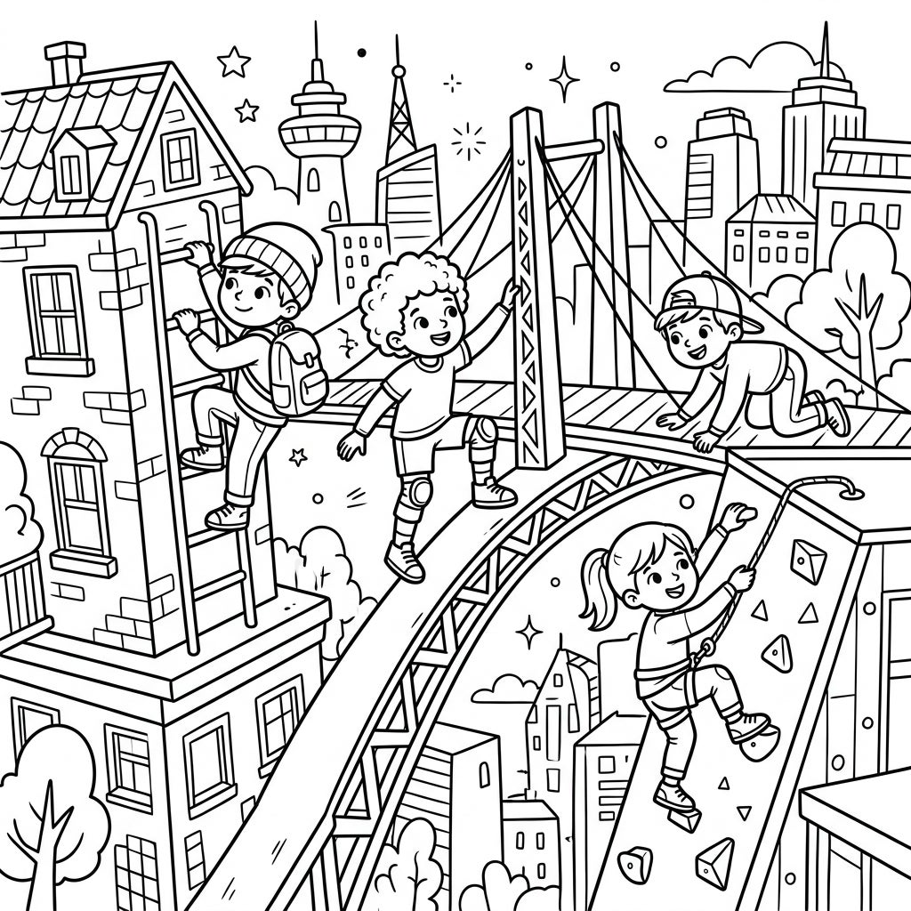 Dive into a vibrant world of imagination with our "Urban Climbers Kids" coloring page! This exciting scene showcases four adventurous children fearlessly navigating a bustling cityscape. From a cheerful boy ascending a ladder on a charming brick building to another scaling a majestic suspension bridge and a girl conquering a rock-climbing wall, every detail sparks a sense of daring exploration.