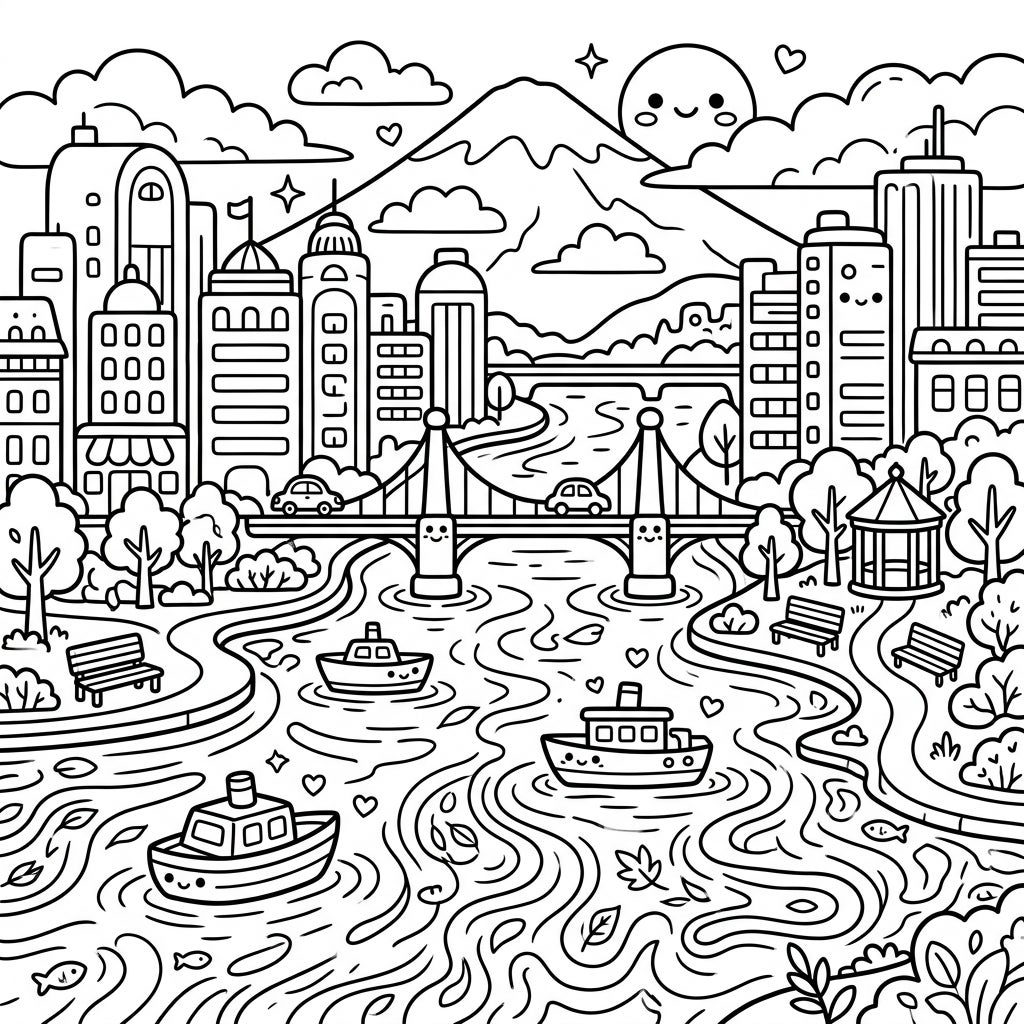 Immerse yourself in this wonderfully whimsical urban lake coloring page, where city life meets natural beauty in the most adorable Kawaii style. Gaze upon charming city buildings, a bustling bridge with tiny cars, and a peaceful lake filled with delightful boats, each sporting sweet, friendly faces. In the background, a majestic mountain watches over the scene, while a happy, smiling sun peeks from behind fluffy clouds, adding to the overall joyful ambiance.
