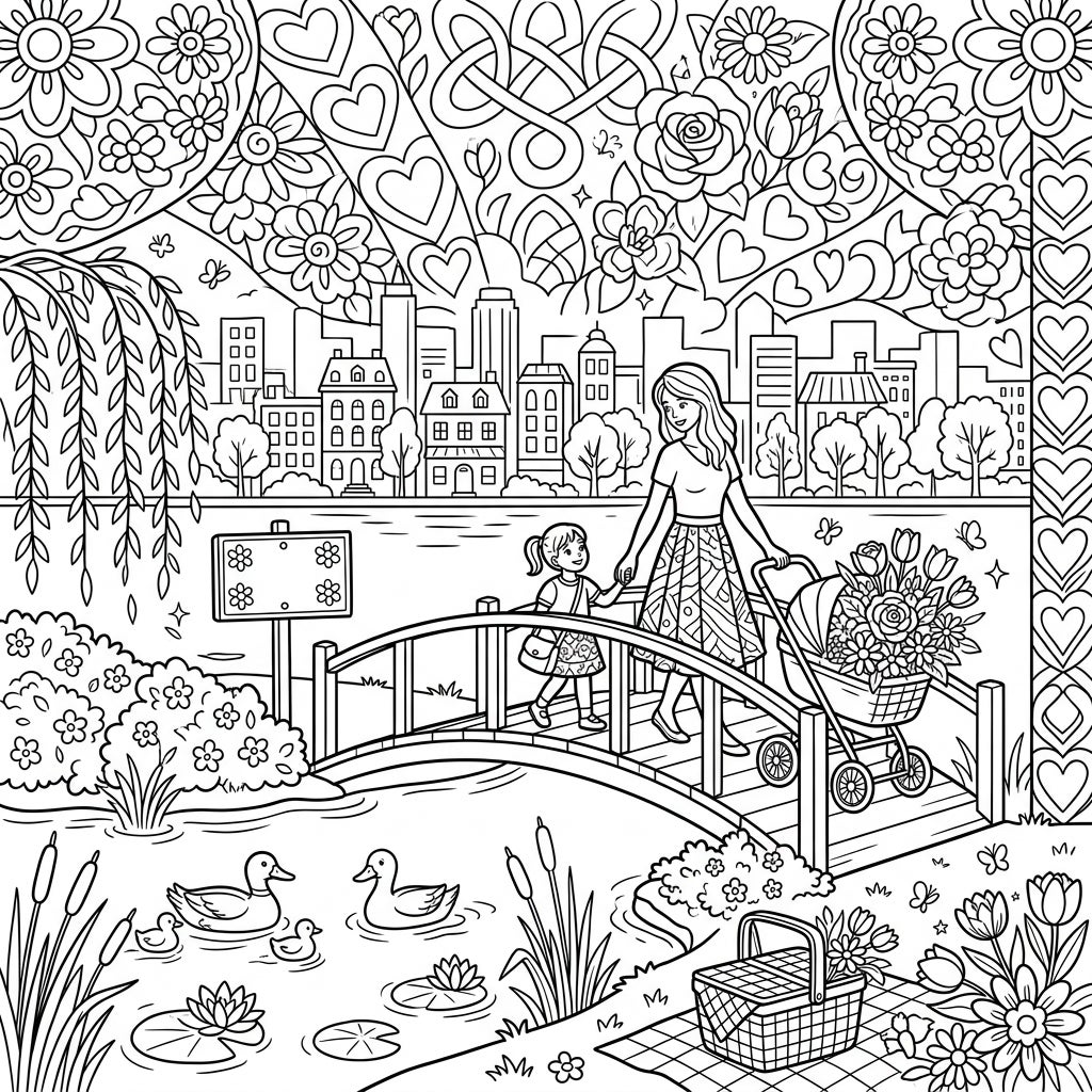 Step into a charming urban oasis where nature meets city life in this delightful Mother's Day coloring page. The intricate line art showcases a mother and her child hand-in-hand, crossing a quaint bridge over a tranquil urban lake. Lush greenery, weeping willows, and playful ducks with their ducklings fill the waterscape, while a vibrant city skyline provides a gentle backdrop. The scene is further enriched with a picnic basket ready for enjoyment, all framed by an abundance of delicate flowers, heartfelt symbols, and elegant Celtic knot patterns.