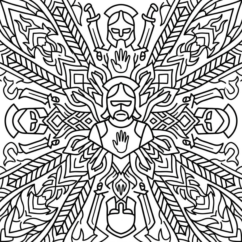 Encourage your child to experiment with a wide range of colors for this Uruk-hai Mandala. Suggest using bright, contrasting hues to make the warrior stand out, and perhaps different shades of earthy tones or metallic colors for the weapons and armor. The symmetrical nature of the mandala also offers a wonderful opportunity to practice color repetition, helping to develop pattern recognition and fine motor skills while having a blast.