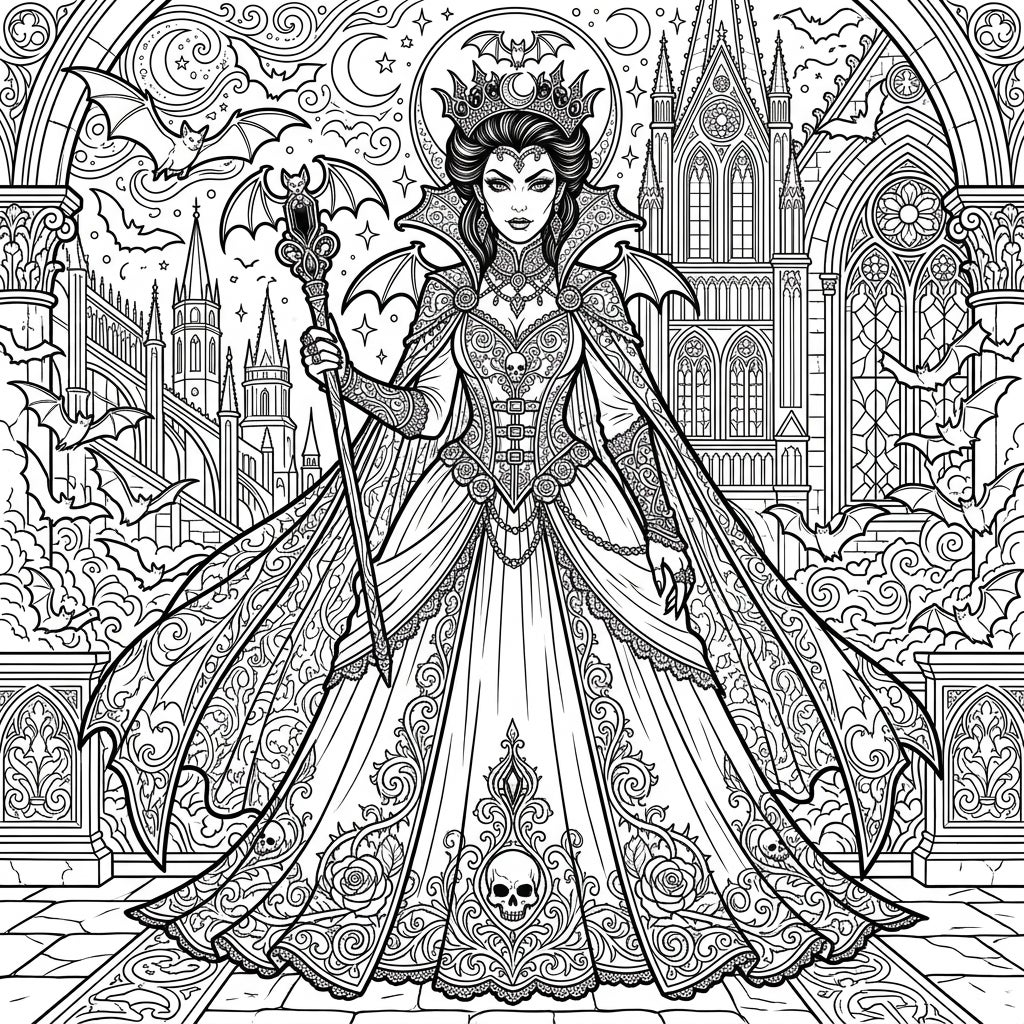 Journey into a breathtaking gothic landscape with our 'Regal Vampire Queen' coloring page. This intricate illustration features a powerful vampire queen, adorned in a lavish gown with delicate lace, flowing capes, and haunting skull motifs. Her majestic presence is amplified by a striking bat-winged crown and a scepter, while soaring bats and towering spires of a gothic castle create a truly immersive backdrop. Every element, from the ornate patterns on her dress to the detailed architectural elements, invites you to explore your artistic vision.