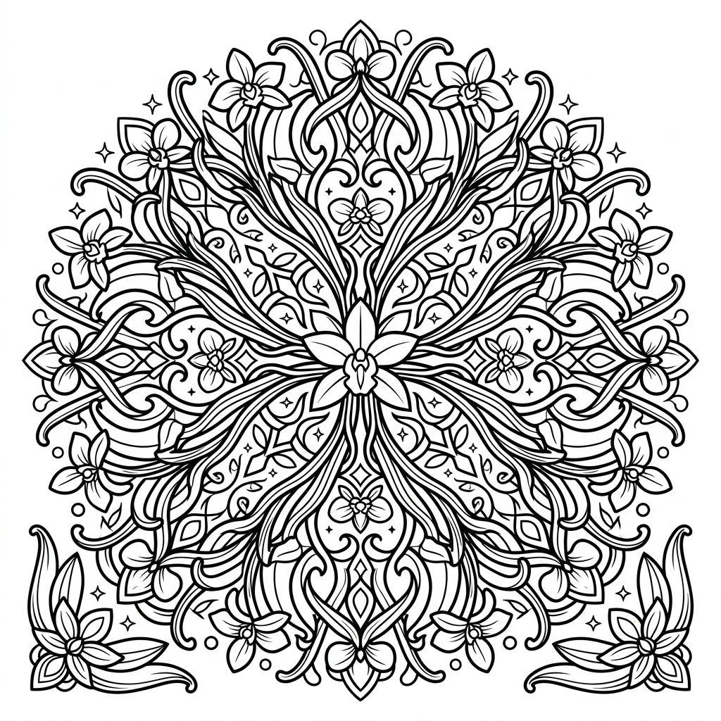 Embark on a captivating artistic journey with our exquisite Vanilla Bean Mandala coloring page. This intricate design showcases the elegant beauty of vanilla, featuring delicate orchid-like flowers and elongated vanilla pods intertwined within a perfectly symmetrical radial composition. Every segment of this stunning mandala blooms from a central point, meticulously crafted with flowing lines and detailed botanical elements that invite your artistic touch.