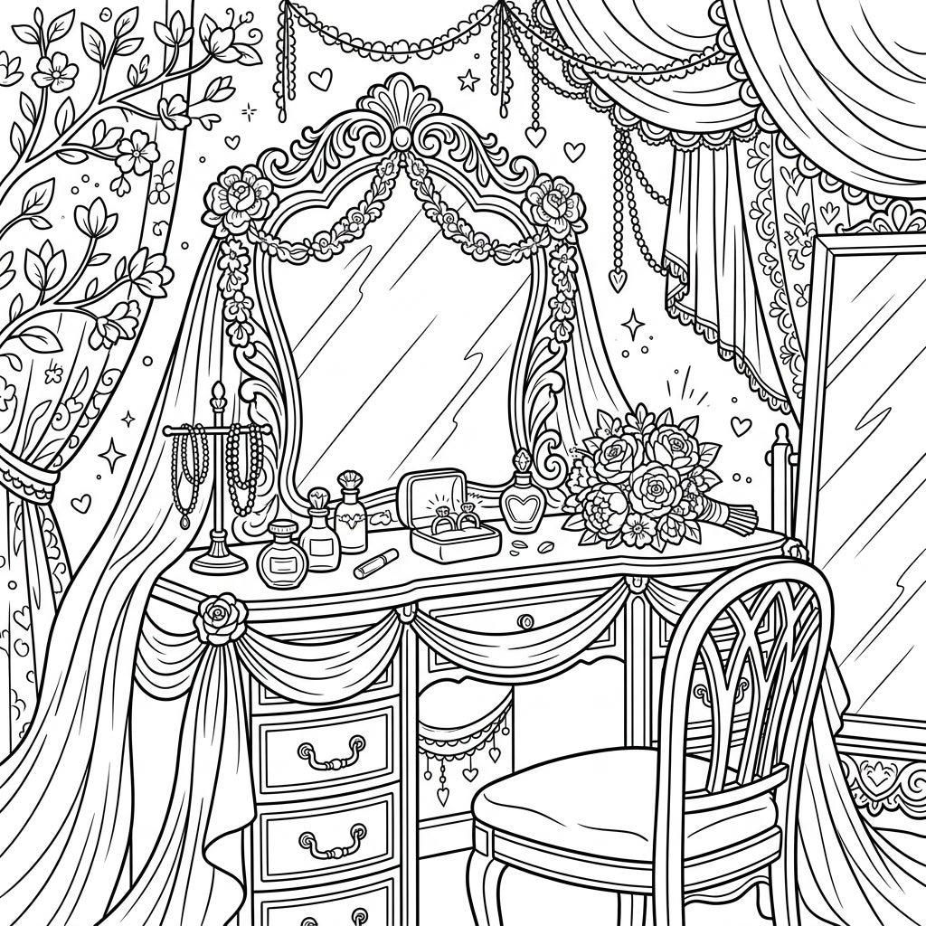 Step into a world of bridal elegance with this beautifully detailed coloring page featuring a classic wedding vanity table. Adorned with delicate flowers, sparkling rings, and a gorgeous bouquet, it's perfect for celebrating love and creativity.