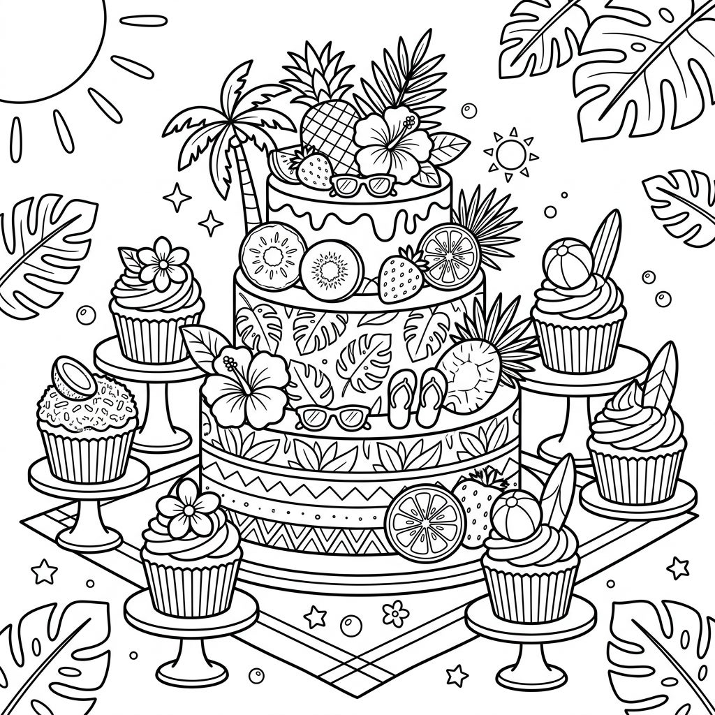 Dive into a delightful summer scene with this intricate coloring page, perfect for young artists! At its heart stands a magnificent multi-tiered vegan cake, generously adorned with vibrant tropical fruits like juicy pineapples, fresh strawberries, and refreshing kiwi and orange slices. Around it, an array of charming cupcakes sit on individual stands, each boasting its own mini-celebration of summer with tiny surfboards, beach balls, and delicate coconut flakes. The detailed line art captures every delightful element, from the elegant hibiscus flowers and playful sunglasses to the tiny palm trees and flip-flops, creating a truly inviting picture.