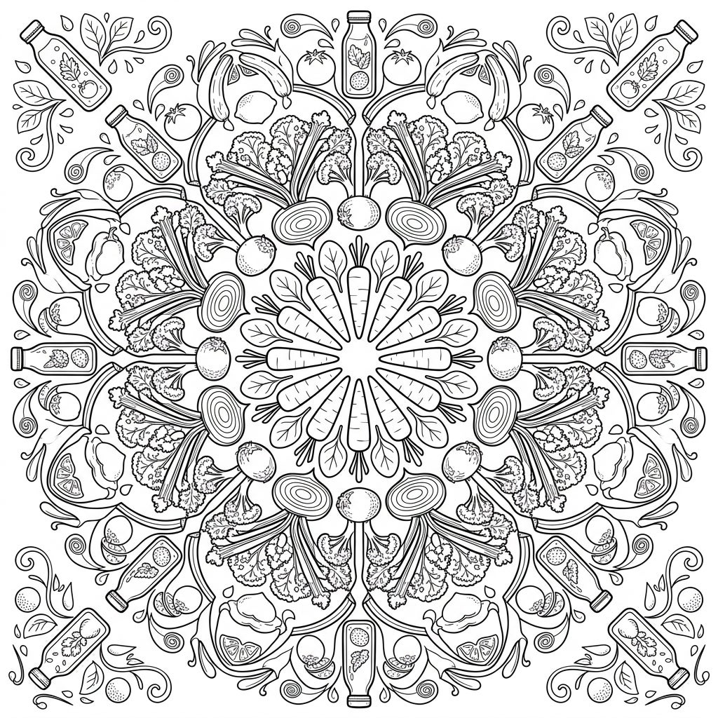 Explore a world of wellness with this unique Vegetable Juice Mandala coloring page, featuring symmetrical patterns of carrots, beets, and refreshing beverages. Perfect for adults and teens seeking a creative and calming artistic escape.
