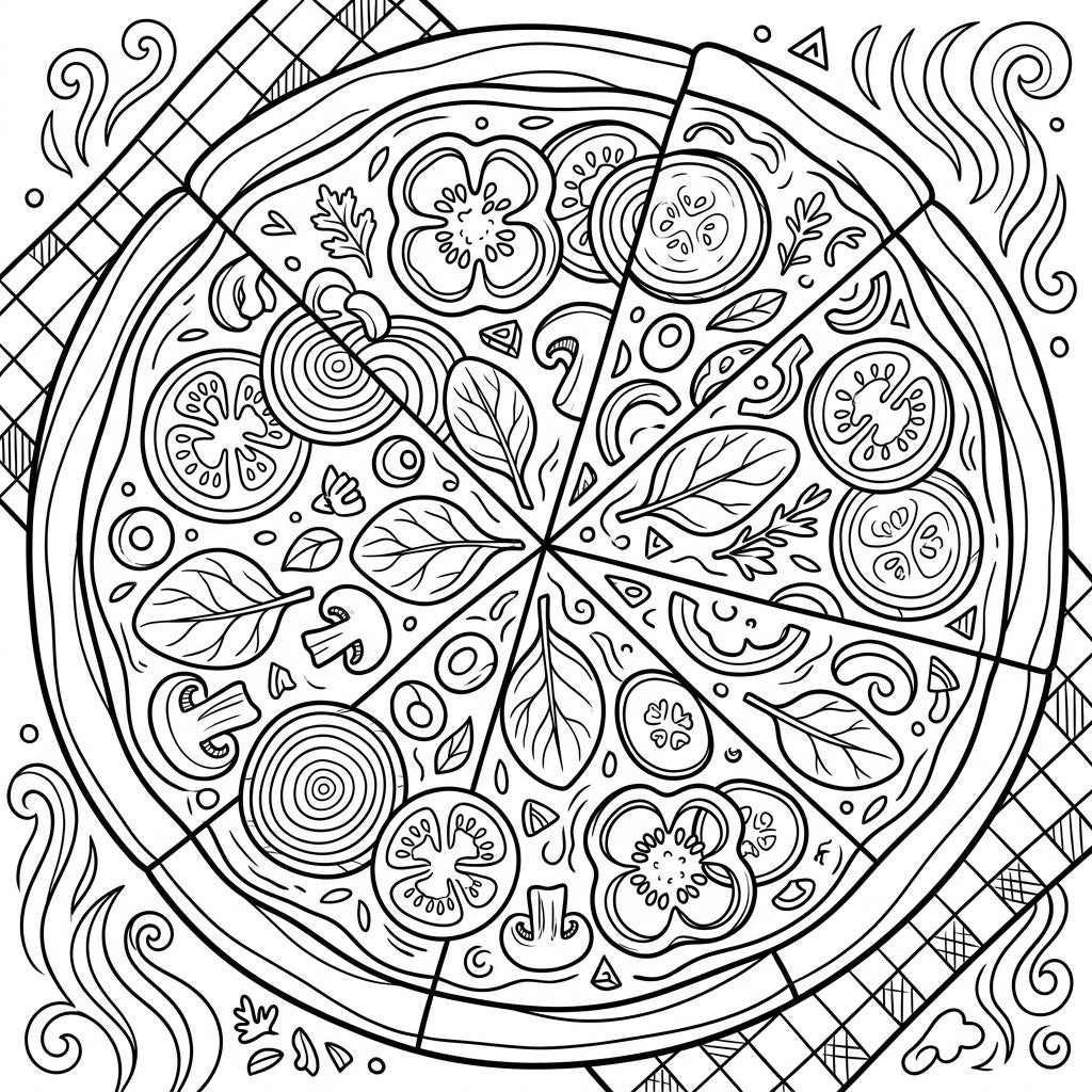 Get ready to add a burst of color to this mouth-watering vegetable pizza! This intricate coloring template features a delicious round pizza, perfectly divided into eight generous slices. Each slice is loaded with a delightful assortment of fresh garden toppings, including crisp bell peppers, savory mushrooms, sweet tomatoes, sliced onions, refreshing cucumbers, and a scattering of spinach leaves and olives. The detailed line work invites you to explore every tiny detail, from the textured crust to the individual seeds within the vegetables.