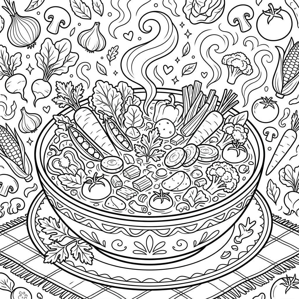 This coloring template evokes the cozy satisfaction of a home-cooked meal and the simple joy of nature's bounty. It celebrates healthy eating and the vibrant colors found in fresh produce. Perfect for anyone who loves cooking, gardening, or simply appreciates the warmth of a hearty bowl of soup, this design offers a relaxing escape and a chance to bring a delicious scene to life.