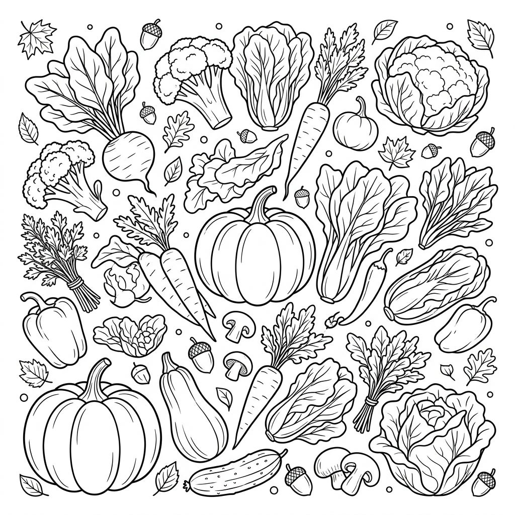Prepare your crayons for a delightful journey through an abundant autumn harvest! This intricately designed coloring page is overflowing with a diverse collection of garden-fresh vegetables and crisp salad ingredients. You'll discover plump pumpkins, elongated carrots with leafy tops, sturdy broccoli florets, various lettuces like bok choy and romaine, bell peppers, mushrooms, and even a hearty beet, all beautifully interspersed with falling maple leaves and tiny acorns, capturing the true essence of fall.