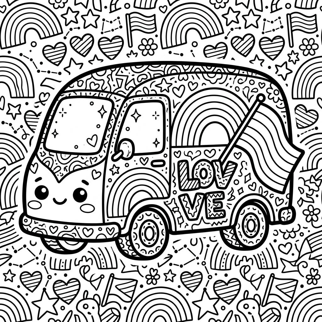 Beyond the vehicle, the entire illustration is a festive tapestry of pride-themed patterns. The background is densely packed with tiny hearts, stars, and more rainbows, creating an immersive and engaging coloring experience that reflects the spirit of love and acceptance. This page isn't just about coloring; it's an invitation to celebrate diversity, express solidarity, and fill your world with the vibrant hues of unity during Pride Month and all year long.