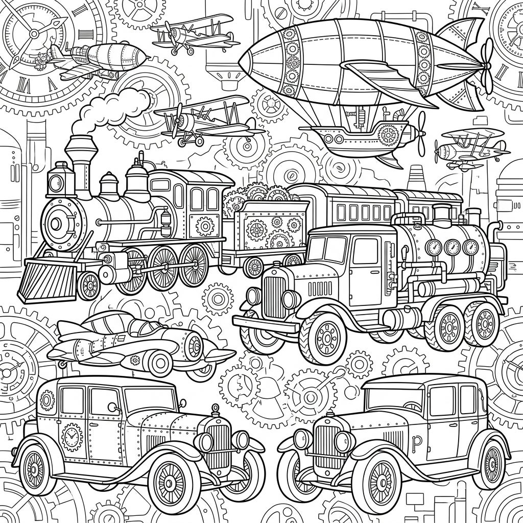 Bring this Steampunk world to life with your favorite coloring tools! Consider using metallic shades like bronze, copper, and silver for the gears and machinery to emphasize their industrial nature, alongside rich earth tones such as deep browns, rust oranges, and muted greens for the vehicle bodies. Don't be afraid to add highlights and shadows to give dimension to the rivets and pipes. Experiment with varying pressures or different mediums to create textured effects, making each steam-powered marvel truly unique and bursting with character. Let your creativity soar as you add color to this captivating mechanical landscape!