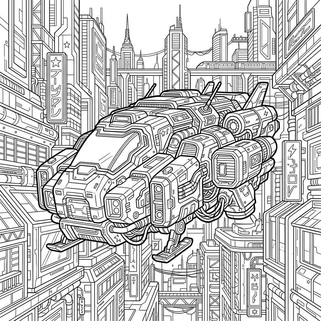 Embark on an epic coloring journey into a vibrant cyberpunk future with this detailed page featuring an advanced futuristic vehicle. This intricate design offers a thrilling artistic challenge for teens who love sci-fi and complex imagery.