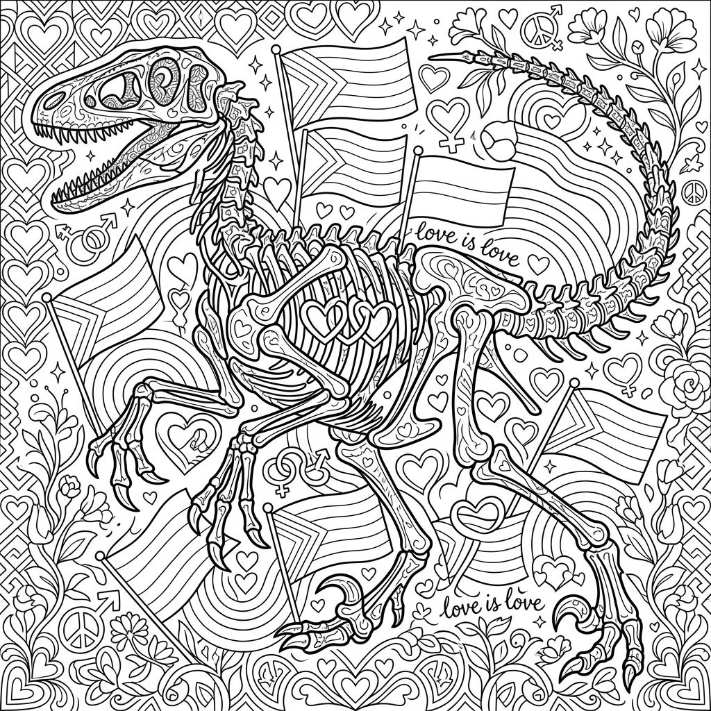 Dive into a prehistoric-meets-pride coloring adventure with this unique Velociraptor fossil design. Celebrate love and diversity as you bring vibrant hues to ancient bones and joyful symbols.