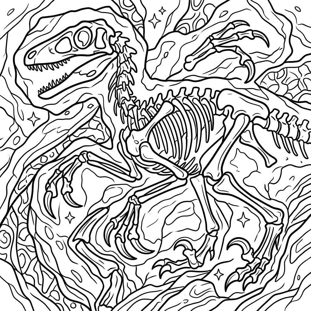 Embark on a prehistoric journey with this captivating Velociraptor fossil coloring page. Delve into the intricate skeletal remains of this fearsome dinosaur, set against a rich backdrop of geological textures.