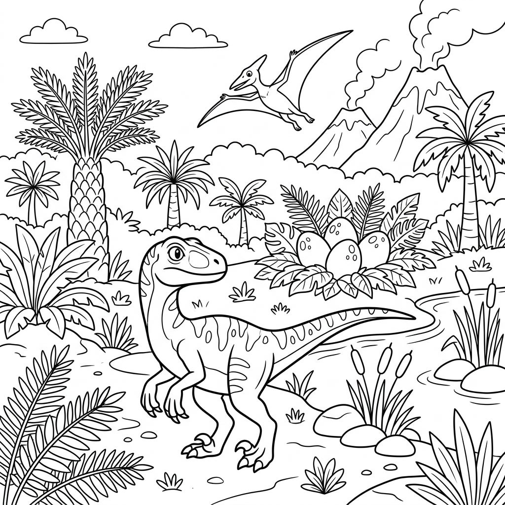 This coloring adventure isn't just about fun; it's an educational trip to a prehistoric world! Imagine the sounds and sights of the Cretaceous era as you color this dynamic habitat. Discover a nest of dinosaur eggs nestled among the foliage, hinting at new life in this ancient ecosystem. This page offers a wonderful opportunity for kids to learn about dinosaurs and their environments while developing fine motor skills and color recognition.
