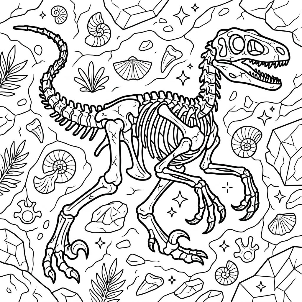 Dive into a thrilling prehistoric scene featuring the intricately detailed skeleton of a Velociraptor, captured in a dynamic, ready-to-pounce stance. Every bone is meticulously outlined, offering a fascinating glimpse into the anatomy of this ancient hunter. The surrounding landscape is a treasure trove of fossilized wonders, including ancient ammonite shells, sharp dinosaur teeth, delicate fern fronds, and angular rock formations, all waiting to be brought to life with your chosen colors.