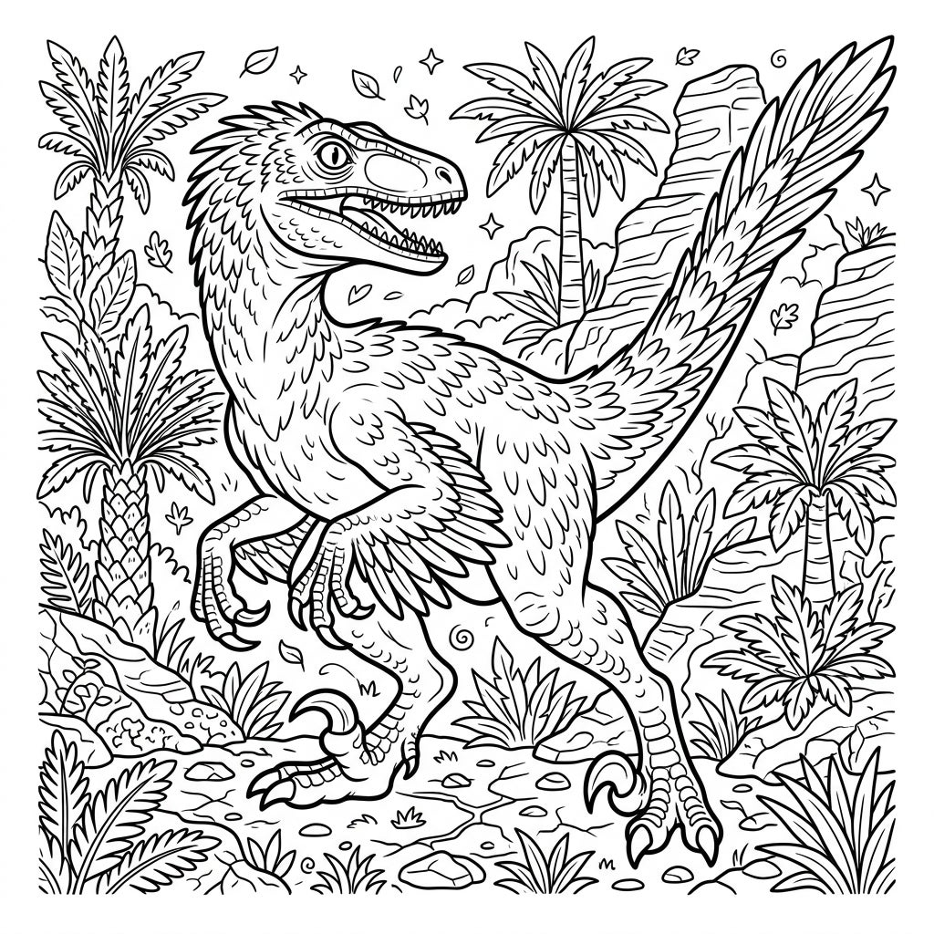 Journey back in time with our captivating Velociraptor species coloring page, showcasing this iconic dinosaur in its natural prehistoric habitat. This detailed line art template invites you to bring a vibrant ancient world to life with your favorite colors.
