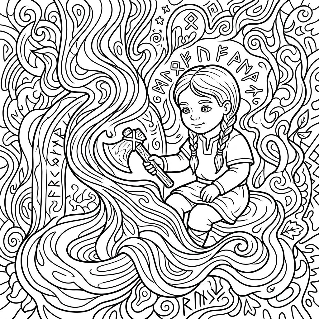 Unleash your creativity with this enchanting coloring page featuring a young Viking child, ready for adventure. Our brave little warrior, with her traditional braided hair and tunic, holds a small, finely detailed axe, symbolizing strength and heritage. The background is a mesmerizing tapestry of swirling, organic lines that evoke a sense of movement and mystery, reminiscent of ancient knotwork intertwined with modern psychedelic art.