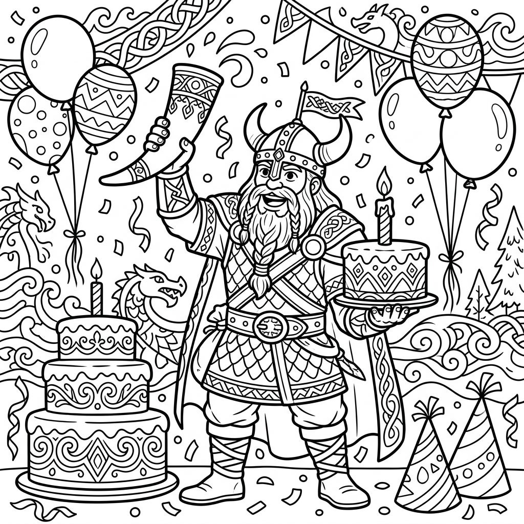 Join a mighty Viking Explorer as he celebrates his special day amidst a joyous birthday party! This unique coloring page combines Norse lore with festive cheer, perfect for adventurers of all ages.