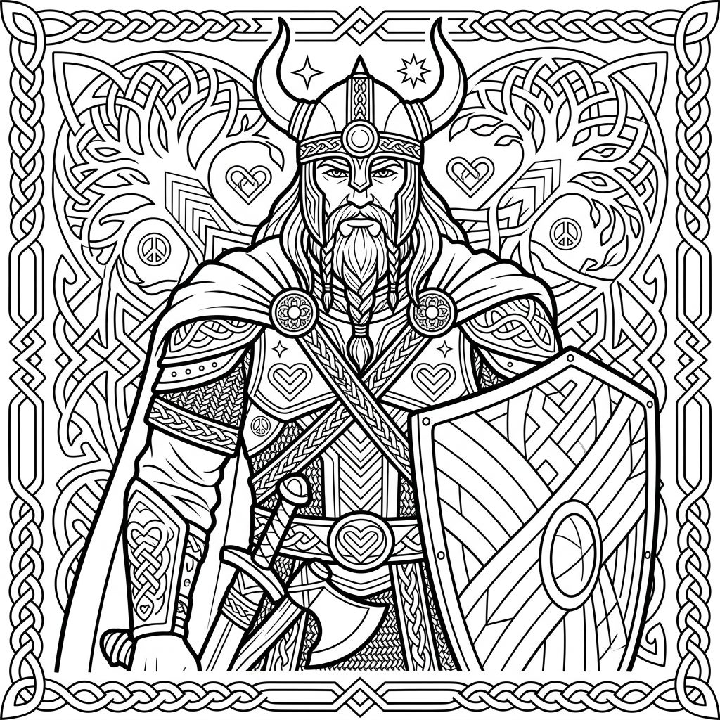 Dive into a richly detailed coloring experience featuring a majestic Viking King, poised with his mighty axe and formidable shield. Adorned in elaborate armor, his helmet boasts impressive horns, capturing the essence of a powerful leader. The intricate background is a tapestry of traditional Nordic knotwork, intertwining with a stylized Tree of Life, and subtly incorporating symbols of love and peace, offering a complex and rewarding challenge for teen colorists.