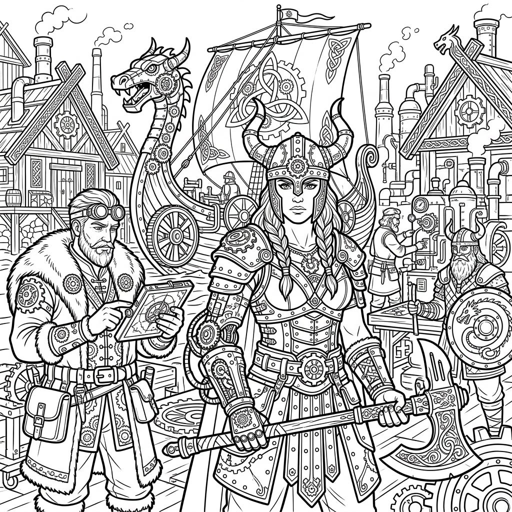 This highly detailed coloring template offers endless possibilities for your artistic flair. Consider using metallic shades for the gears, brass elements, and armor to truly bring out the Steampunk essence, contrasting with earthy tones for the furs and wooden structures. Experiment with vibrant colors for the Celtic knots and the longship's sail to make them pop, or delve into a more monochromatic palette to emphasize the industrial vibe. Whether you prefer bold hues or subtle shading, let your imagination guide you in transforming this intricate black-and-white canvas into a colorful saga of your own.