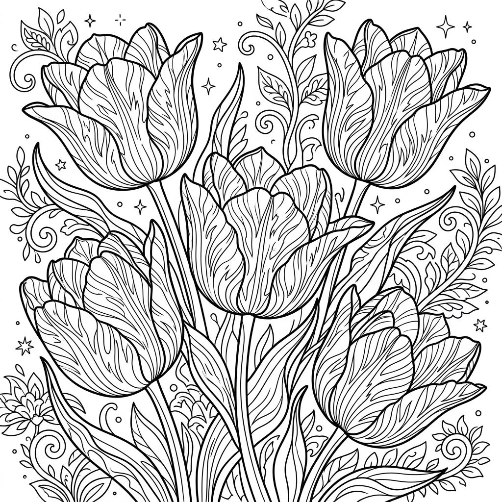 Beyond just a floral depiction, this template is crafted to be a sanctuary of calm and creativity. As you bring these detailed Viridiflora Tulips to life, you'll find a perfect opportunity for stress relief and mindful engagement. The dense composition, complete with swirling vines, tiny stars, and delicate botanical motifs filling the background, ensures a satisfying artistic challenge that captivates and relaxes.