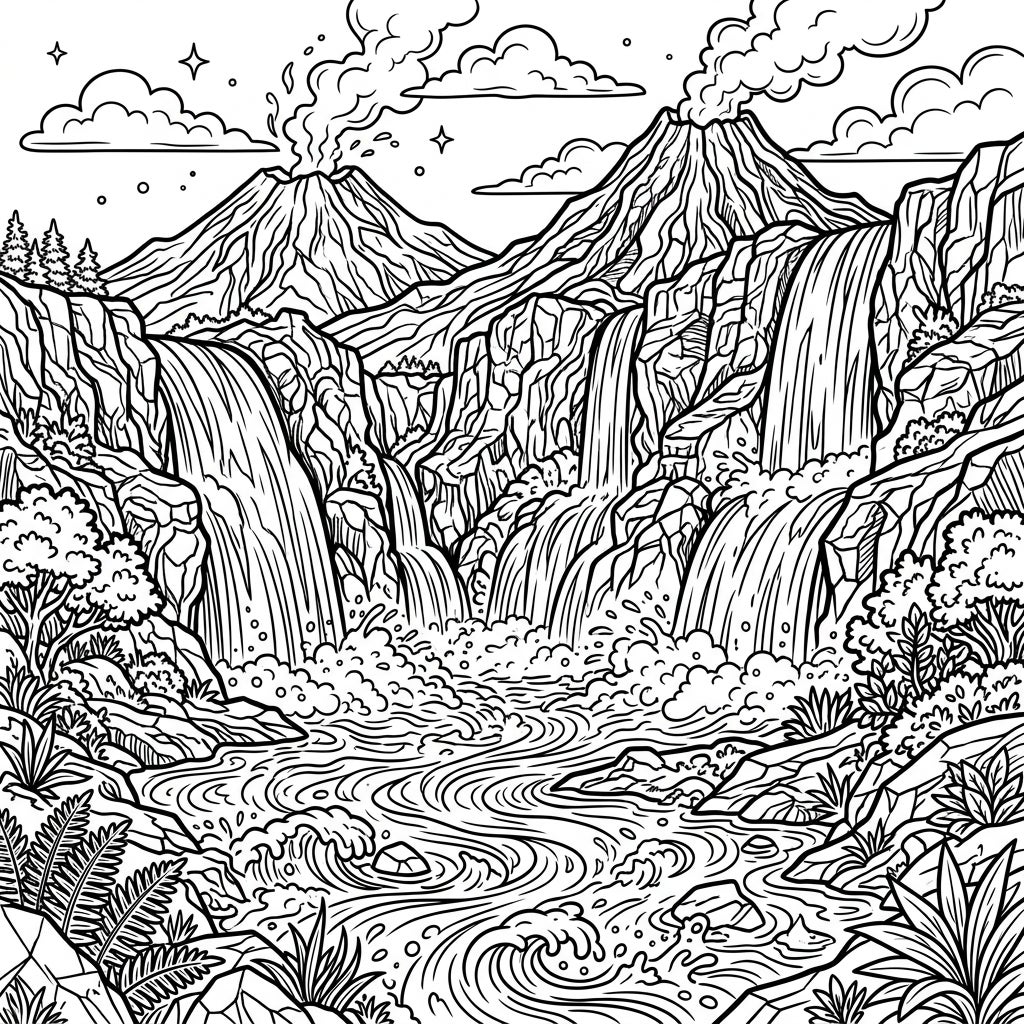 Prepare to be mesmerized by this stunning coloring page, a true spectacle of nature's raw power. It features a grand volcanic landscape, where towering, smoking volcanoes punctuate the horizon under a starry sky. Majestic waterfalls plunge dramatically over jagged, volcanic rock formations, creating a dynamic visual flow that captivates the eye and invites artistic interpretation. The intricate line work captures every detail, from the turbulent waters of the river below to the lush, wild foliage clinging to the rocky terrain, offering a rich tapestry for your coloring imagination.