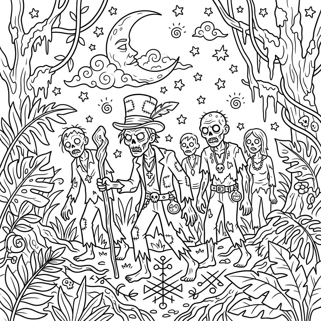 Step into a world of moonlit mystery with our Voodoo Zombies coloring page, perfect for those who love spooky nocturnal themes. This intricate design features a bokor leading their zombie entourage through an atmospheric jungle scene.
