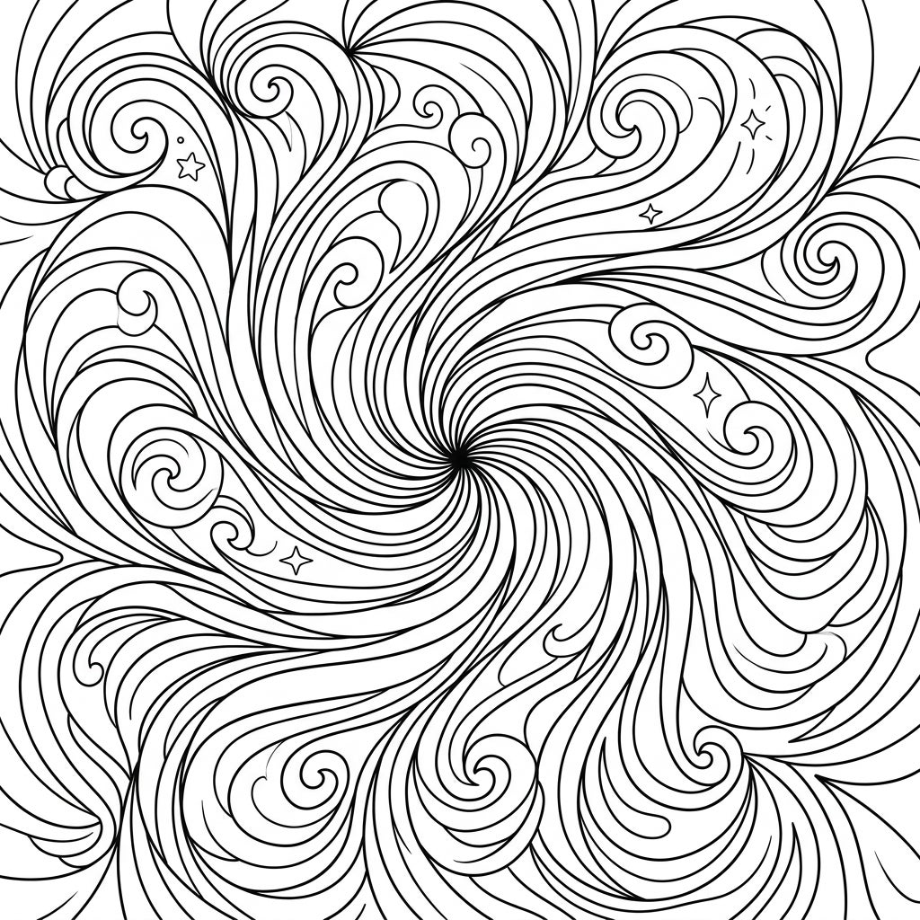 Unleash your creativity and bring this vortex to life with your favorite colors. Experiment with gradients to enhance the swirling effect, or use contrasting hues to highlight individual spirals. Consider a harmonious palette of blues and greens for a water-like vortex, or fiery reds and oranges for an energetic swirl. This design is also perfect for exploring shading techniques, adding your own personal touch to every curve and star.