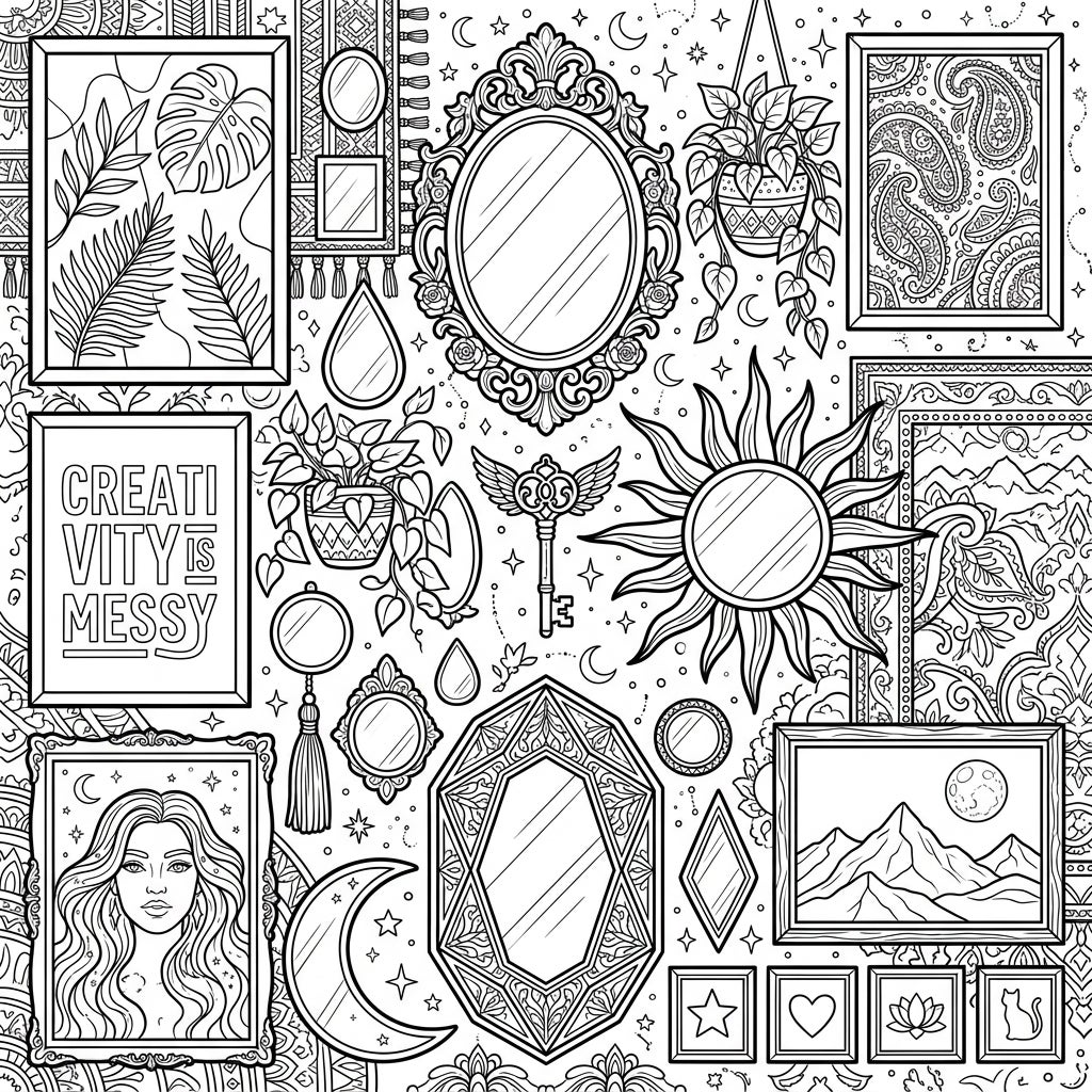 This intricate coloring page invites you to explore a stylish collection of wall art and decorative mirrors, crafted with teens in mind. Discover a fascinating array of framed pieces, from lush botanical prints featuring monstera leaves and hanging plants, to a framed portrait of a serene woman, and a motivational 'Creativity is Messy' quote. The scene is further enriched with diverse mirrors, including a grand ornate oval mirror, a radiant sun-shaped mirror, a mystical crescent moon, and geometric designs, all nestled amidst a captivating backdrop of subtle patterns and celestial motifs like stars and moons.