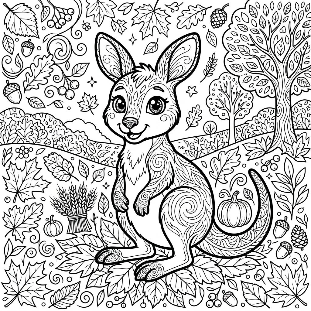 Embark on an enchanting autumn journey with this delightful coloring page featuring a charming wallaby. Surrounded by intricate fall foliage and harvest treasures, it's a perfect activity to celebrate the season.