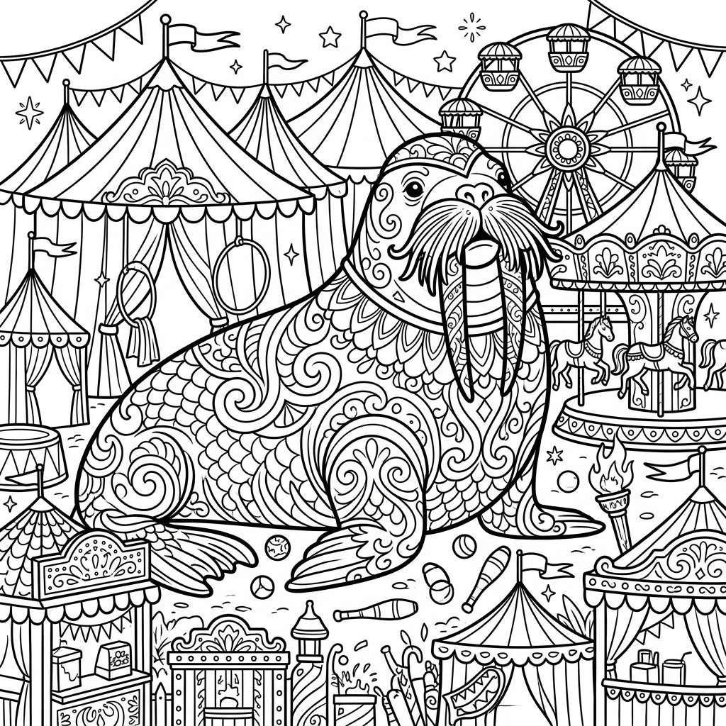 Immerse yourself in a whimsical carnival scene featuring a majestic walrus adorned with detailed patterns. This intricate adult coloring page promises hours of relaxation and creative expression.