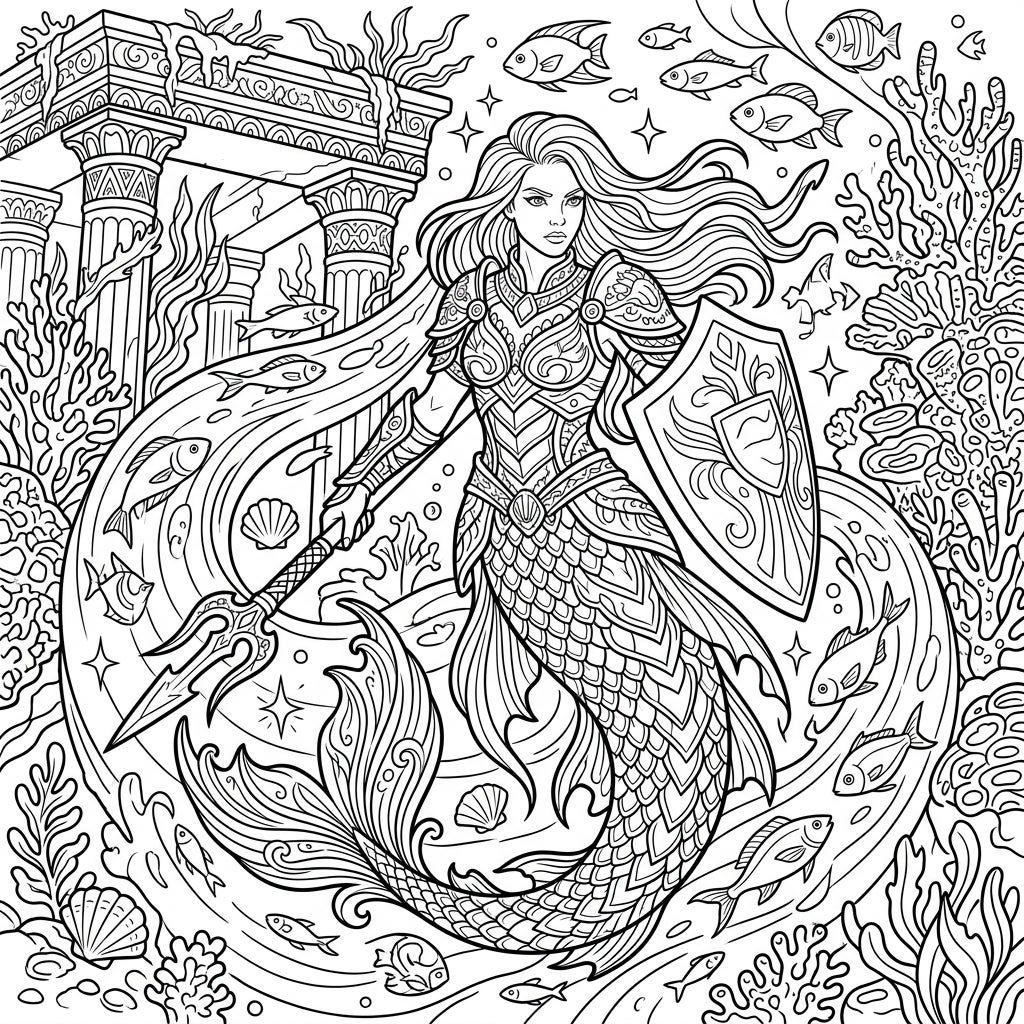 Embark on an epic coloring adventure with a fierce warrior mermaid, armored and ready with her trident and shield. Her mystical underwater realm, featuring ancient ruins and swirling fish, awaits your creative touch.