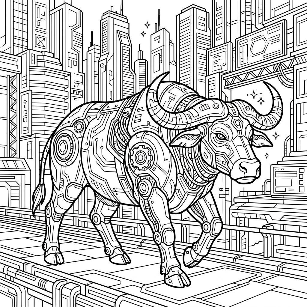Bring this futuristic vision to life with your favorite colors! Experiment with vibrant neon hues for the circuit lines and robotic elements to truly capture the cyberpunk essence. Consider metallic shades for the buffalo's body, contrasted with deep blues, purples, and electric greens for the urban skyline to create a stunning visual impact. Don't shy away from adding your own creative flair to the digital patterns and illuminated structures, making this unique artwork truly your own.