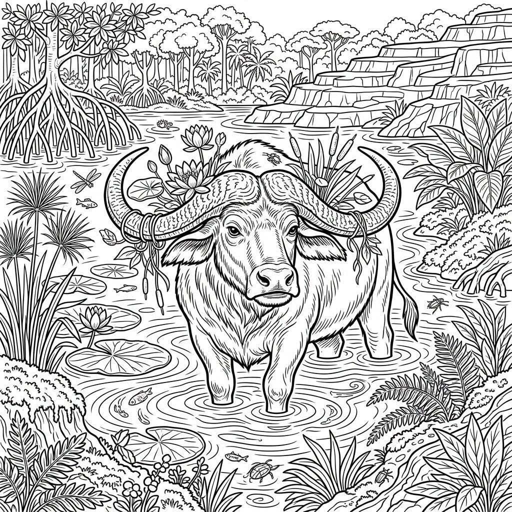 Embark on an artistic journey with this incredibly detailed full scene coloring page, centered around a magnificent water buffalo. Its impressive, curving horns are adorned with delicate water lilies and cascading vines, highlighting its harmonious presence in nature. The surrounding wetland teems with life, showcasing intricate lily pads, tall reeds, and exotic aquatic flora, inviting you to explore every nuanced element of its habitat.