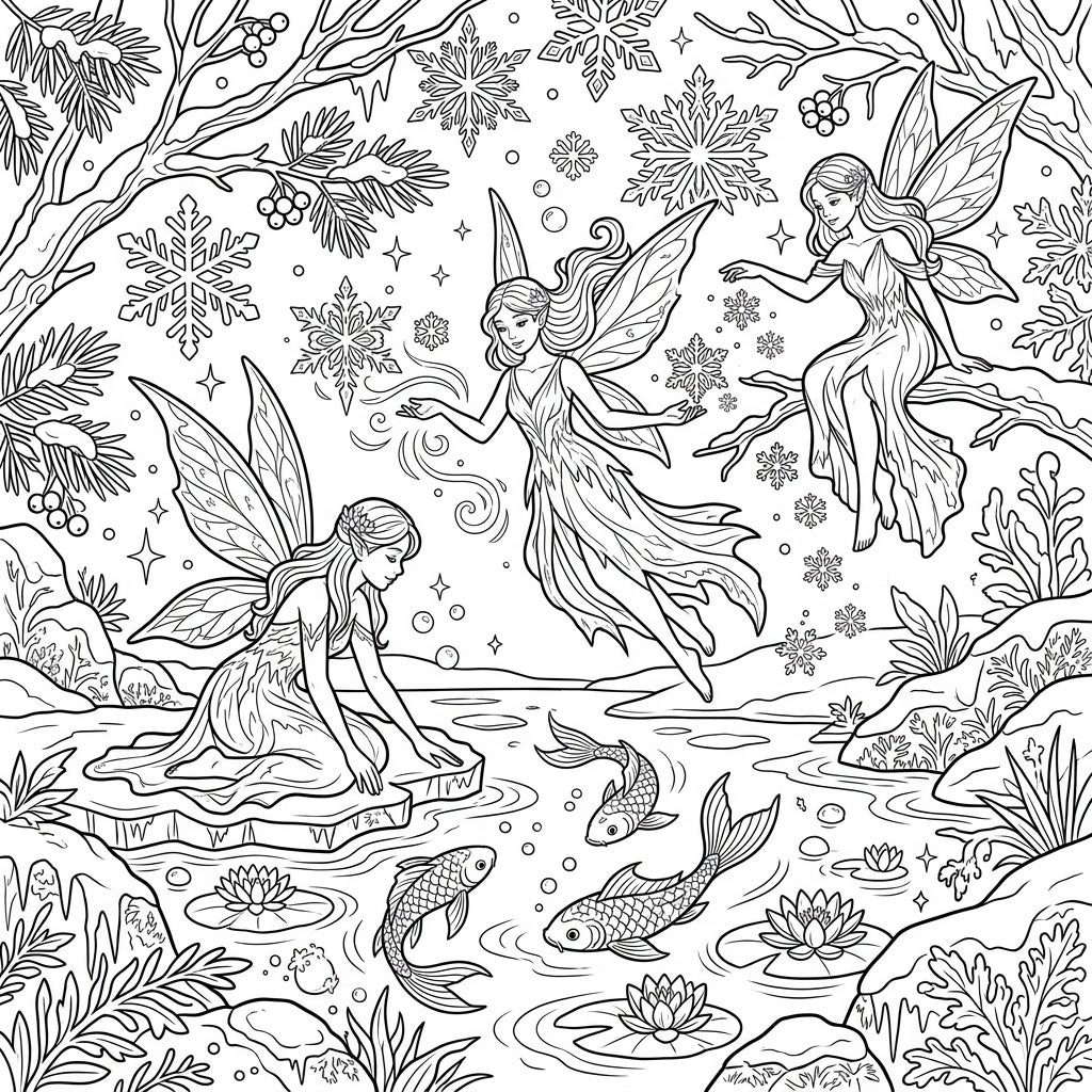 This coloring page beautifully captures the serene yet enchanting spirit of a winter wonderland, where the mystical world of water fairies intertwines with the crisp beauty of the season. The background is a tapestry of frosty branches laden with berries, intricate ice crystals, and unique snowflake patterns, all contributing to a rich, immersive environment. Below, graceful fish swim amongst water lilies in the clear, icy waters, protected by their fairy guardians, creating a harmonious blend of nature's chill and magical warmth.
